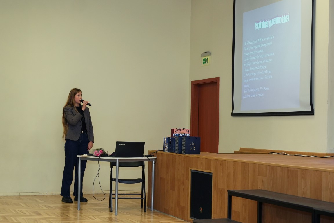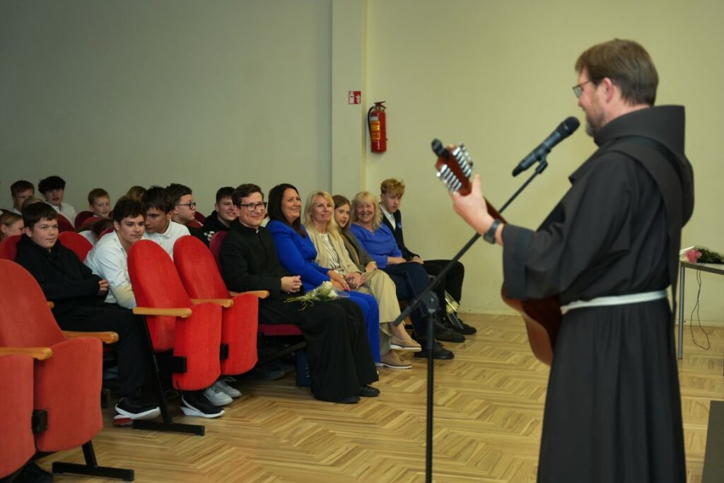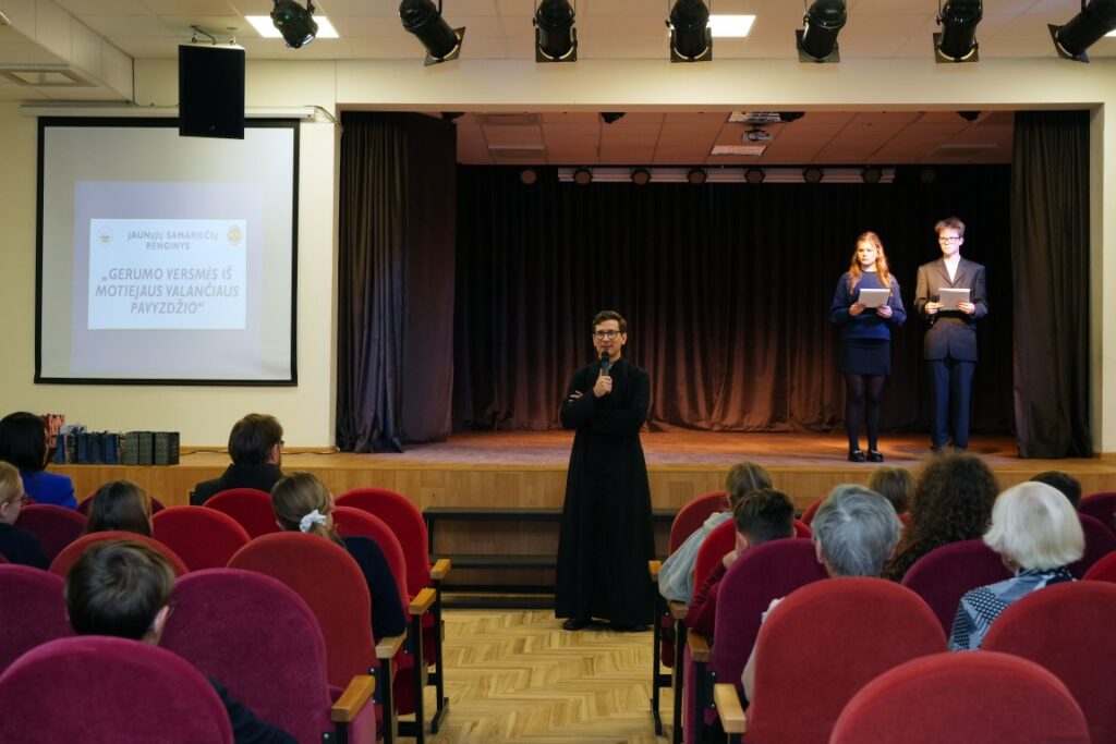 Renginys, kuris skirtas Motiejaus Valančiaus 225 – osioms metinėms paminėti, vyko bendradarbiaujant su Šiaulių „Romuvos“ progimnazijos ir Šiaulių Juliaus Janonio gimnazijos jaunaisiais samariečiais. Renginį gražiu šokiu „Lelijų tyvuliavimas“ pradėjo šiuolaikinių šokio studija „Kosmėja“ (vadovės Diana Maciuvienė ir Livija Andruškevičiūtė). Progimnazijos direktorė Asta Vaičiūnienė pasidžiaugė mokinių geranoriškumu, atjauta, pagalba ir meile savanoriaujant, pasveikino mokyklų jaunuosius samariečius, visiems linkėjo iniciatyvumo skleidžiant gėrį, sekant Motiejaus Valančiaus pavyzdžiu. Šiaulių Švč. Mergelės Marijos Nekaltojo Prasidėjimo bažnyčios kunigas Gediminas Kasperavičius jaunimui pasakojo apie Motiejaus Valančiaus gyvenimo kelią, atskleidė jo asmenybės bruožus, padrąsino jaunimą būti tomis švieselėmis, kurios neužgestų, neštų šilumą ir meilę. Pranešimą „Vyskupo Motiejaus Valančiaus – gerumo kelias“ skaitė 8d kl. mokinė Dominyka Erlickaitė (mokytoja Inga Valeikienė). Dainų progimnazijos 7-8 kl. jaunieji samariečiai Liudas Pikūnas, Pranas Klovas, Kristupas Karazija, Adrijus Zimka, Arnas Marcinkus, Ąžuolas Ponelis, Adrijus Racevičius, Norvydas Valiulis, Orestas Novikovas suvaidino gailestingojo samariečio istoriją. ,,Romuvos“ progimnazijos jaunųjų samariečių vadovė Saulė Raubickaitė pristatė jaunųjų samariečių priesaiką. Renginyje skambėjo dainavimo studijos „Vivo“, 7d kl. mokinės Ugnės Kazlauskaitės daina ,,Vidury žemyno“ (vadovė Ingrida Jonavičienė). Brolis Paulius Vaineikis, pranciškonų vienuolis iš Kryžių kalno vienuolyno, pasidžiaugė jaukia, gražia Dainų progimnazija, gabiais mokiniais, kurie šoko, vaidino, dainavo. Jis savo prasmingais žodžiais bei giesmėmis liudijo meilę ir tikėjimą. Lietuvos samariečių bendrijos Šiaulių skyriaus pirmininkė, Šiaulių Juliaus Janonio gimnazijos samariečių vadovė Danutė Kratukienė sveikino jaunuosius samariečius, įteikė kiekvienam „Samariečio ženklelį“, jaunimui linkėjo tobulinti savo lyderystės įgūdžius, daryti gerus darbus su didele meile. Renginį vedė 8a kl. mokiniai Faustina Bloškytė ir Benas Vasiliauskas. Už gražias šventės akimirkų nuotraukas dėkojame Linai Pčelincevaitei.