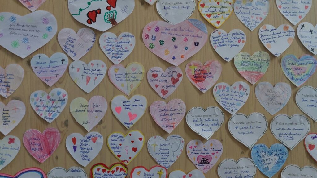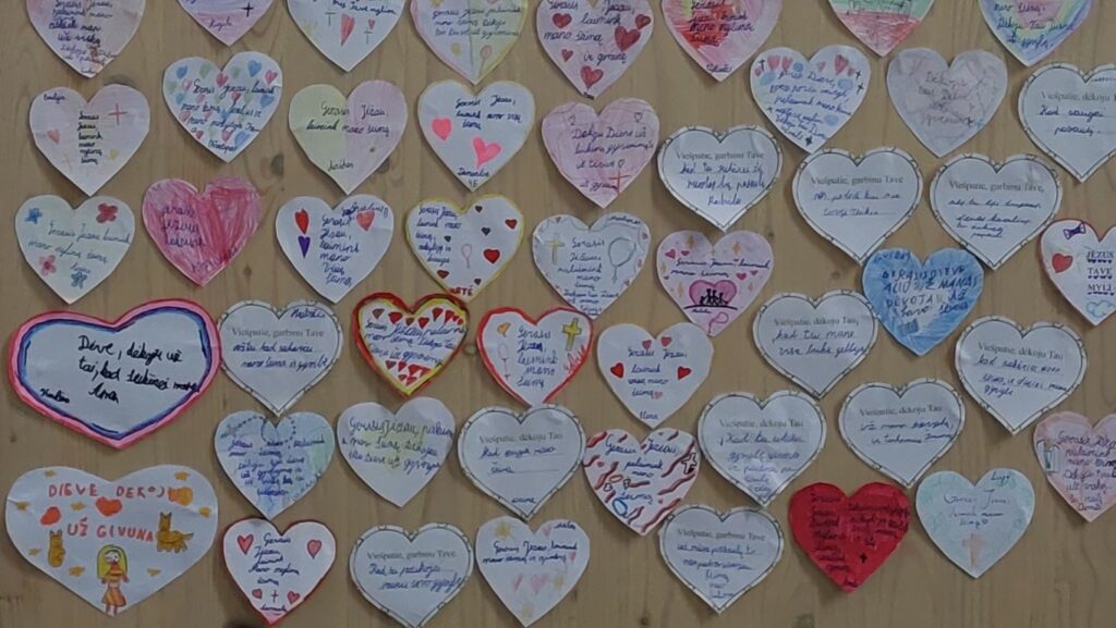 Vaikai širdelėse užrašė savo prašymus, padėkas. Palaiminti Švenčiausiuoju Sakramentu mokiniai neš dievišką meilę ir gerumu dalinsis su visais.
