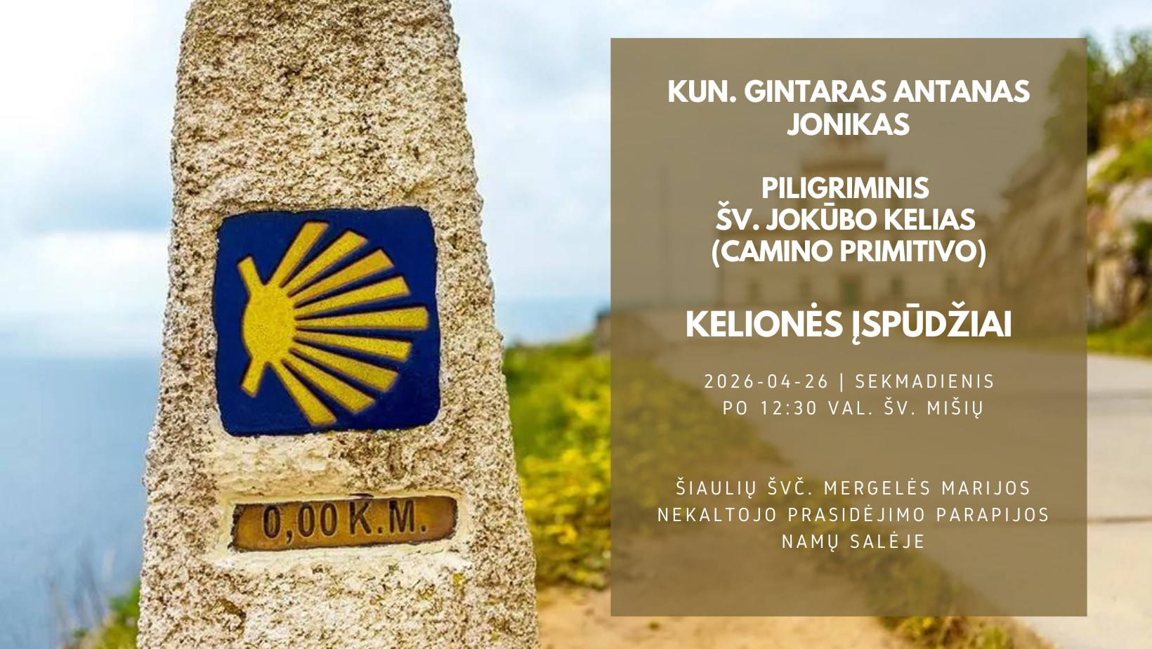 Balandžio 26 d., sekmadienį, po Sumos šv. Mišių (apie 13:30), parapijos namų salėje klebonas kun. Gintaras Antanas Jonikas dalinsis įžvalgomis iš savo piligriminės kelionės Camino Primitivo keliu.