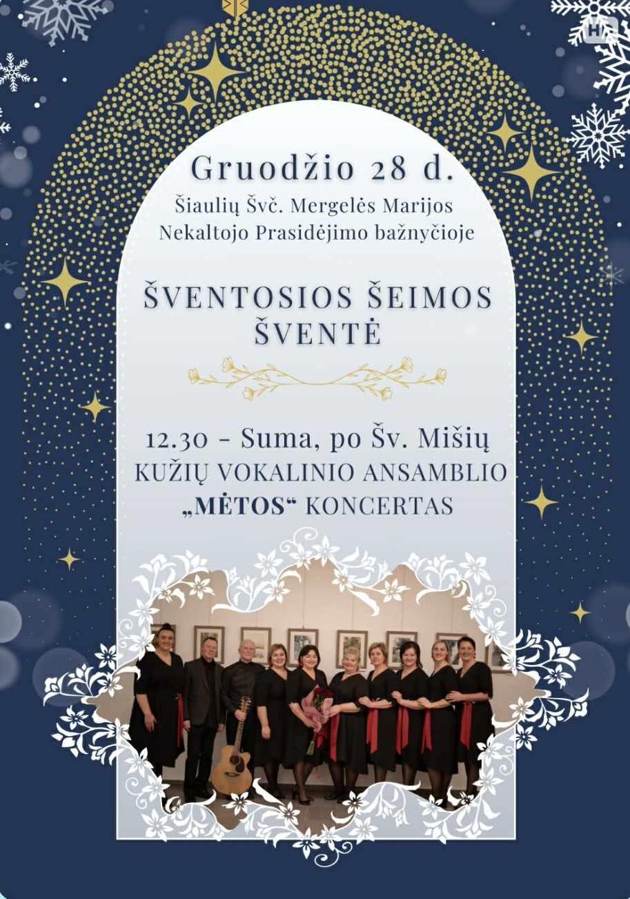 Gruodžio 28 d., minint Šventosios Šeimos – Jėzaus, Marijos ir Juozapo – iškilmę, po 12:30 Sumos šv. Mišių kviečiame pasilikti bendrystei. Šventinę nuotaiką kurs Kūžių vokalinis ansamblis „Mėtos“.