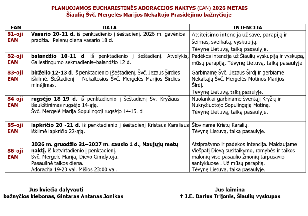 Planuojamas metinis 2026 m. visų adoracijos naktų sąrašas.